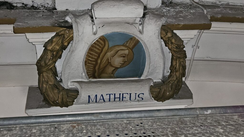 In de middenbeuk, het koor en de kruisbeuk is een metershoge stelling gebouwd. Bovenaan wordt een platform met vloer geplaatst waarop dan met een kleinere rolstelling verder tot aan het gewelf kan worden gewerkt. Zo kan men vlot aan het pleisterwerk van het gewelf om dit na te kijken, bij te werken waar nodig en later te schilderen.