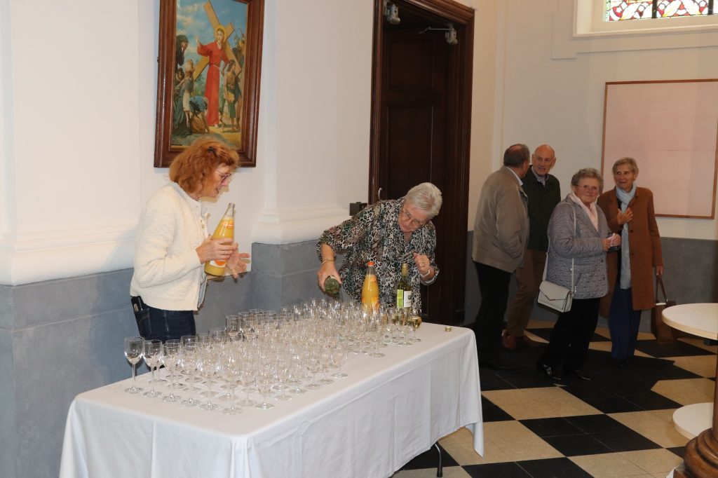 Bij het binnenkomen werd iedereen verwelkomd en ontving men een glaasje wijn, fruitsap of water.