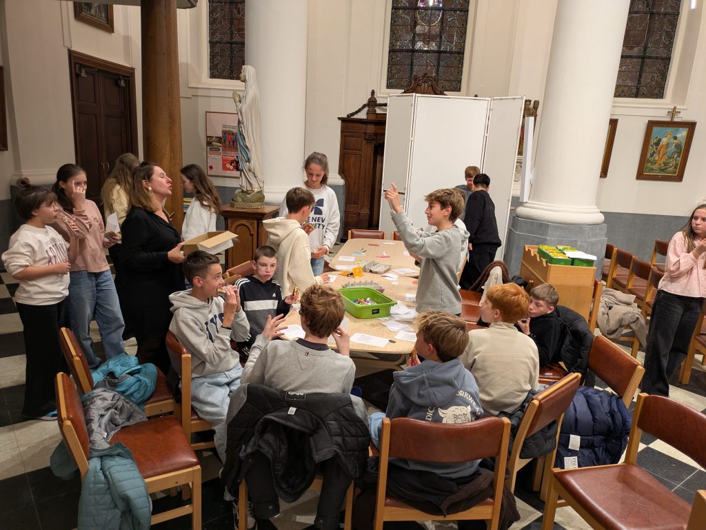 Vrijdagavond 15 november 2025 was er vanaf 18.00 u. een gezellige drukte in de kerk. Met een 20-tal vormelingen kwamen we de eerste keer samen. Elk van hen had de betekenis van de eigen naam opgezocht en in enkele steekwoorden op een kaartje geschreven. Wanneer iemand zich had voorgesteld was het een zoektocht voor de anderen om het juiste kaartje op de tafel te zoeken.
