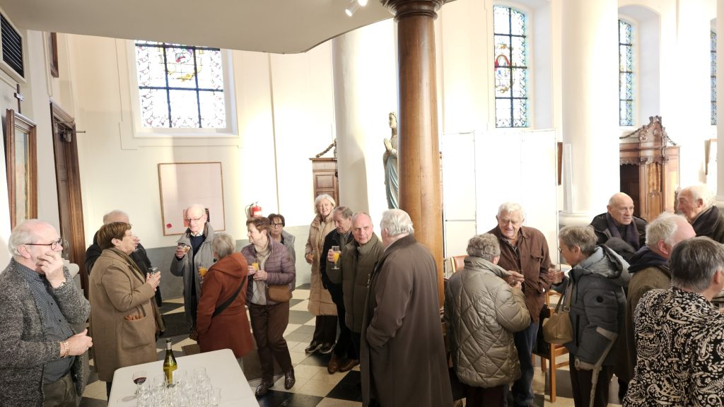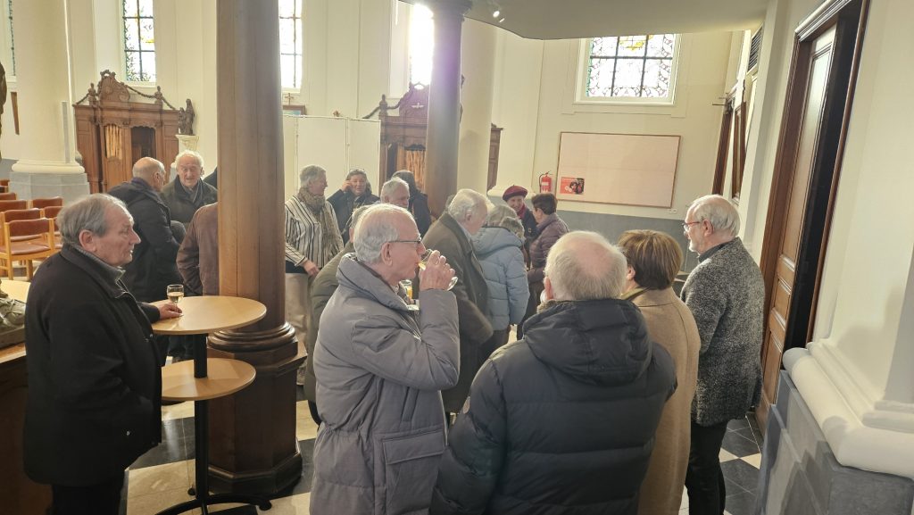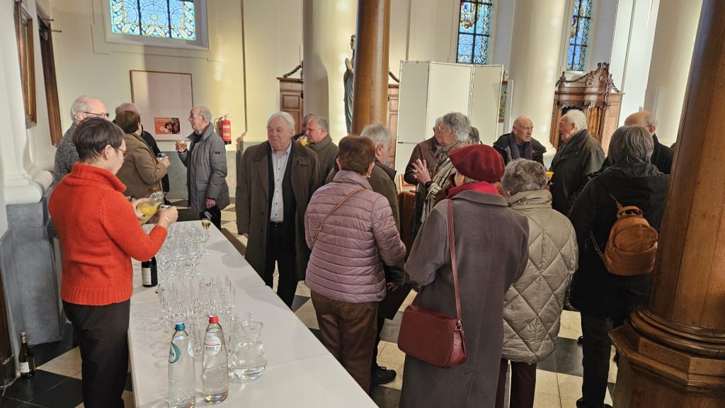 Na de eerste viering van het nieuwe jaar verzamelden de aanwezigen achteraan in de kerk om met een glaasje in de hand te proosten op het nieuwe jaar 2026.